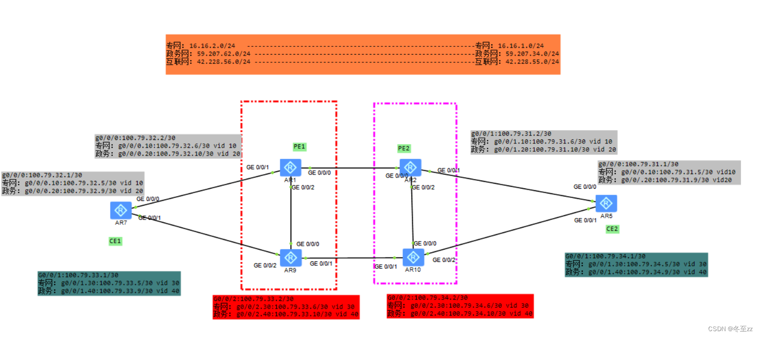 路由之间通过实例隔离,骨干设备运行mpls,建立MP-IBGP邻居,传递专网和政务网络的实例路由。