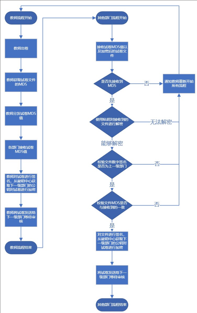- 审批人收到完后,首先使用自己本地的私钥对试卷进行解密,解密的内容包含了试卷本身和上一个人的签名,签名是为了防止中间人攻击,所以还需要使用上一个人的的公钥进行验证这个签名,然后对解密出来的试卷取一次MD5值,跟本地的试卷的MD5值进行比较,防止试卷内容被修改。