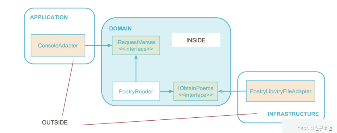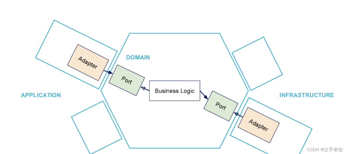内部端口和适配器:将应用程序划分为核心业务逻辑(Application)和外部环境(Infrastructure)两部分,内部端口表示系统对外部环境提供的服务,而内部适配器则负责将内部数据结构适应外部环境的需求。