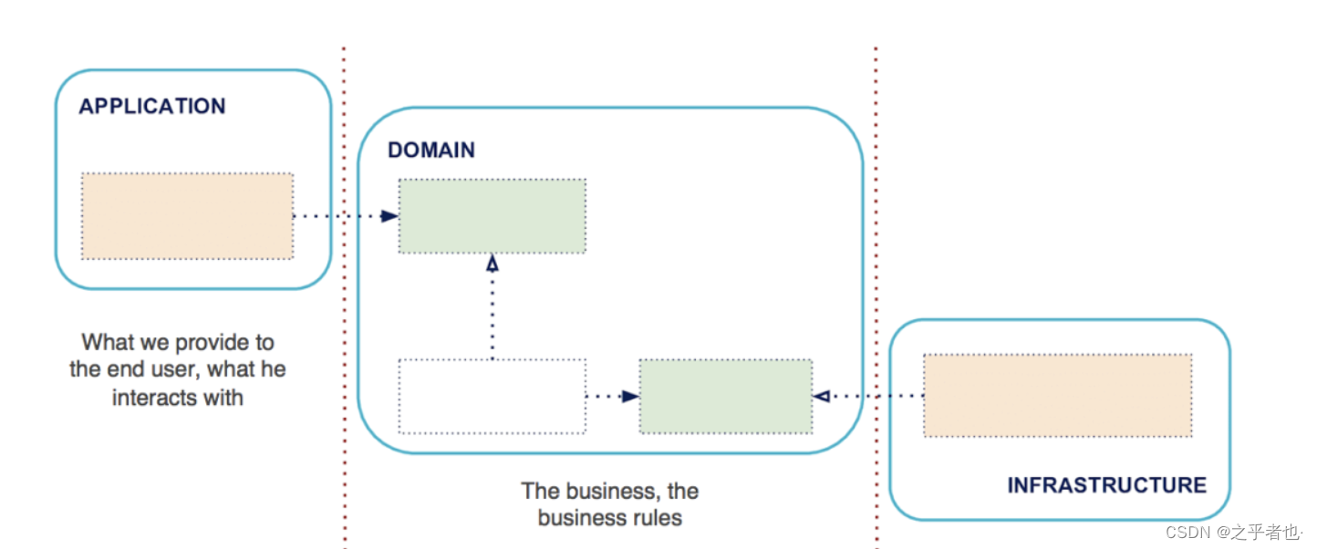依赖关系指向领域层(Dependencies are going from Application and infrastructure to the Domain)