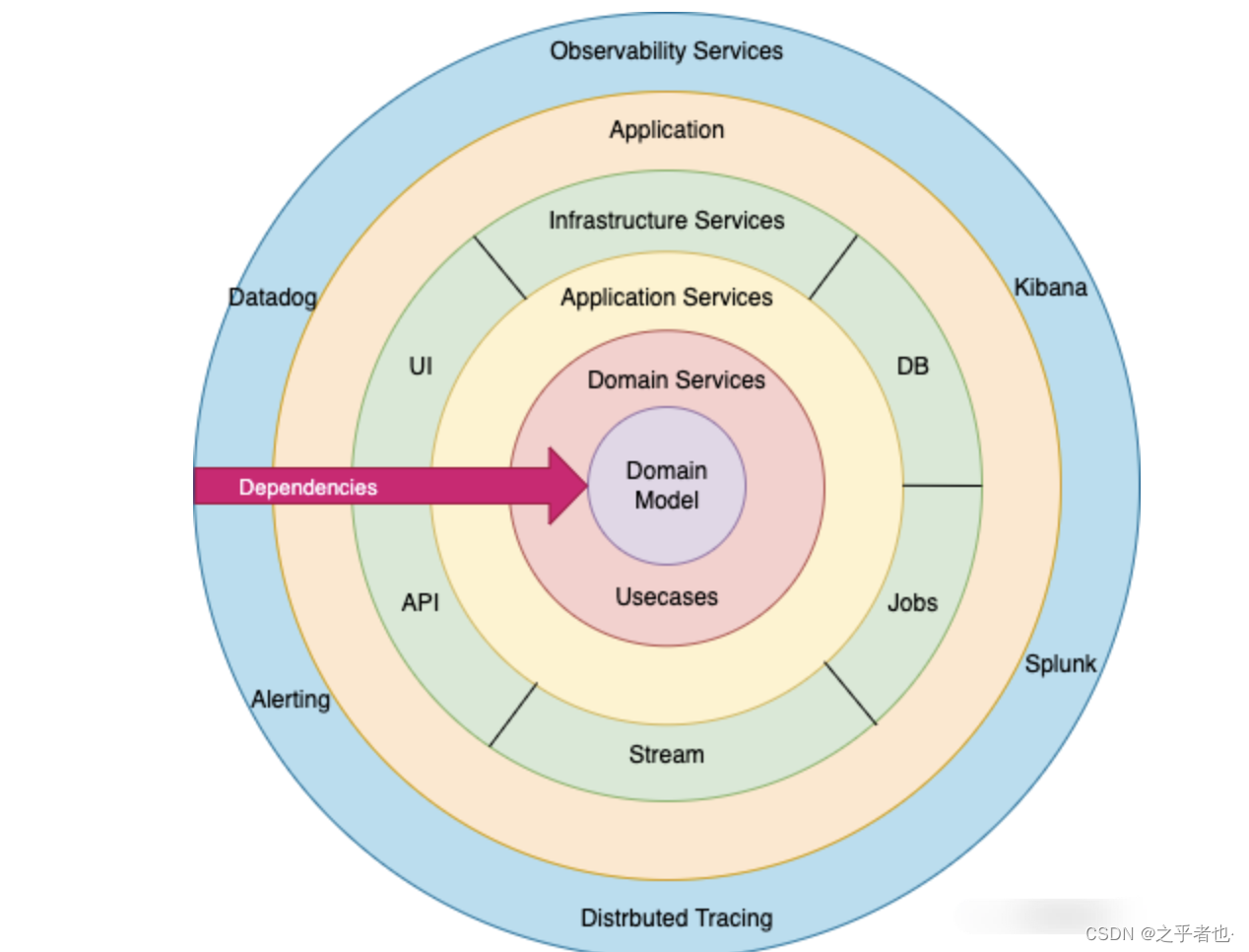 依赖性:洋葱架构中的圆圈代表不同的责任层,进入越深越接近领域和业务规则,外圈代表机制,内圈代表核心领域逻辑,外层依赖于内层,而内层对外圈一无所知