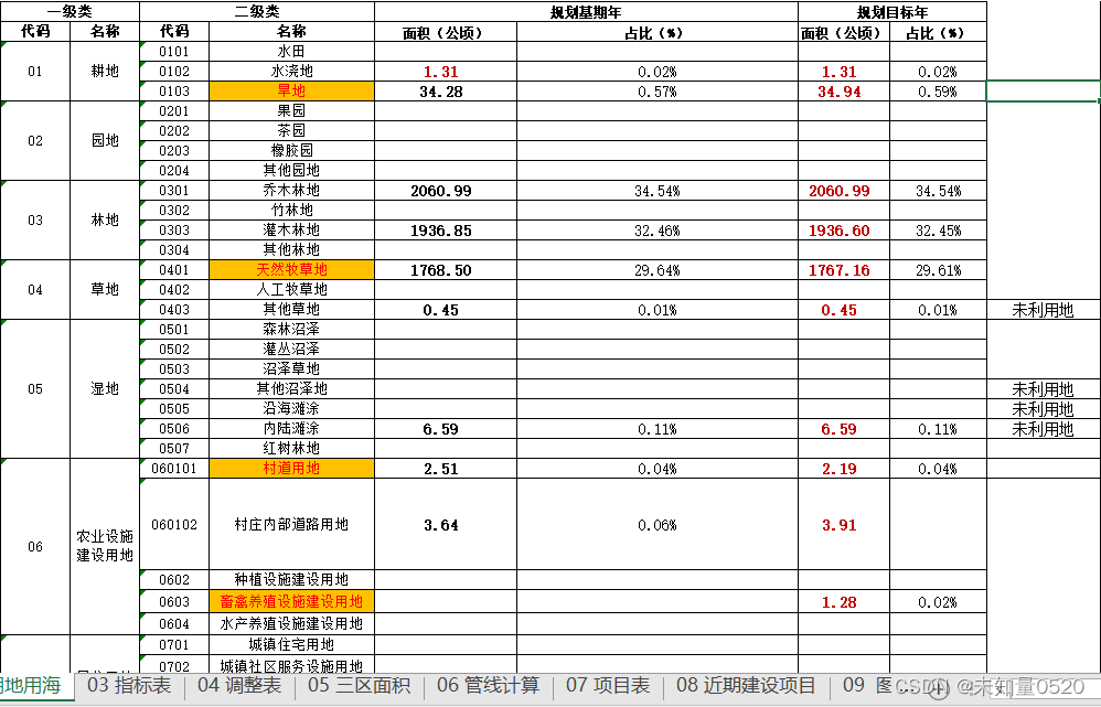 【菜鸟の笔记_利用Excel自动总结表格数据_自动链接word文本】 国土空间规划,用地用海数据表格如下图:编撰村庄规划文本,需要对土地利用现状进行描述。通常的做法对照表格,逐个进行描述。然而,后期图斑经常改动,每当一个数据修改时,文本逐个对照检查,容易遗漏、出错且效率低下。需要自动总结,超链接后,自动更新。