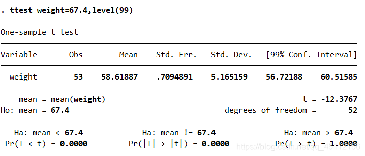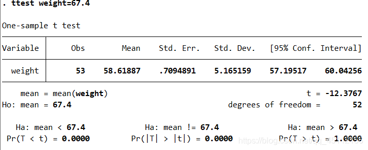我们可以看出一共有53个样本参与了假设检验,样本的均值是58.61887、标准误是0.7094891、标准差是5.165159、95%置信度区间是[57.19517 60.04256]。样本的T值是-12.3767、自由度是52,Pr(|T|>|t|)=0.0000,远小于0.05,需要拒绝原假设,也就是说该校大四学生的体重与五年前相比有显著差异。