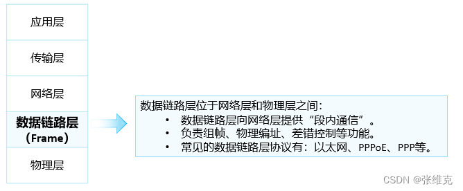 数据链路层位于网络层和物理层之间,可以向网络层的IP、IPv6等协议提供服务。数据链路层的PDU被称为Frame(帧)。