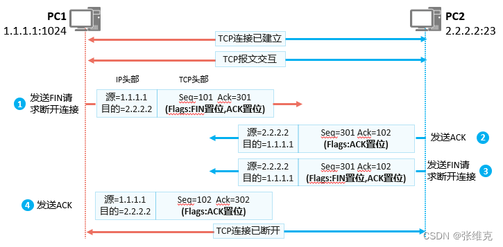 4. PC1收到FIN置位的TCP报文,回复ACK报文,TCP双向连接断开。