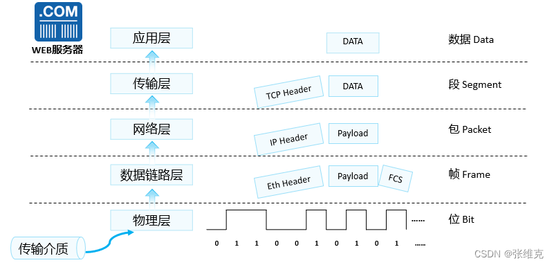 数据接收:网络设备收到数据后,进行基于TCP/IP五层模型,由下往上逐层解除封装,直至看到应用层数据为止的过程