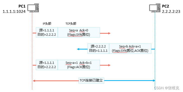 (3)主动端收到被动端的报文后,产生一份ACK报文,其中ack=b+1,用于对被动端向主动端的连接请求进行确认;