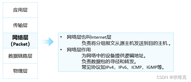 IP(Internet Protocol,互联网协议):将传输层的数据封装成数据包并完成源站点到目的站点的转发,提供无连接的、不可靠的服务。