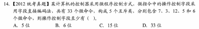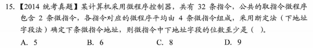 解:有32条指令,各指令对应的 微指令平均为4条,因此平均有128条微指令,加上公共的取址微指令130,得知位数至少为8位。选C