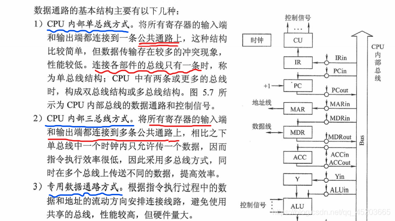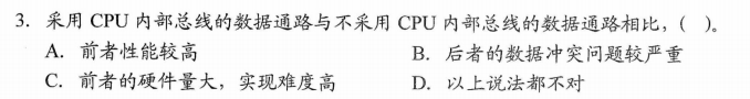 解:我们要先知道数据通路的几种基本结构:内部单总线、内部三总线、专用数据通路,题目就是让我们用内部总线的方式和专用数据通路进行对比,对于总线结构,比较简单,但效率较低,并且容易引起数据冲突,后者性能较高,但所需的硬件量比较大,因此说法都不正确选D。