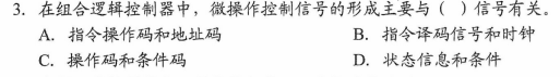 解:组合逻辑控制器,也叫硬布线控制器,微操作的控制型号的形成来源主要有1.经过译码器翻译的操作码,2.标志,单元的反馈信息,3.时序系统的节拍,周期,因此,选B;