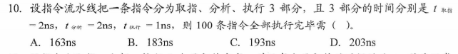 解:这题其实画图好理解一些,首先,取2ns作为每个机器周期的间隔标准,第一条指令5s完成,剩余的99条每过2ns执行一条,总时间为5+99*2=203ns,选D