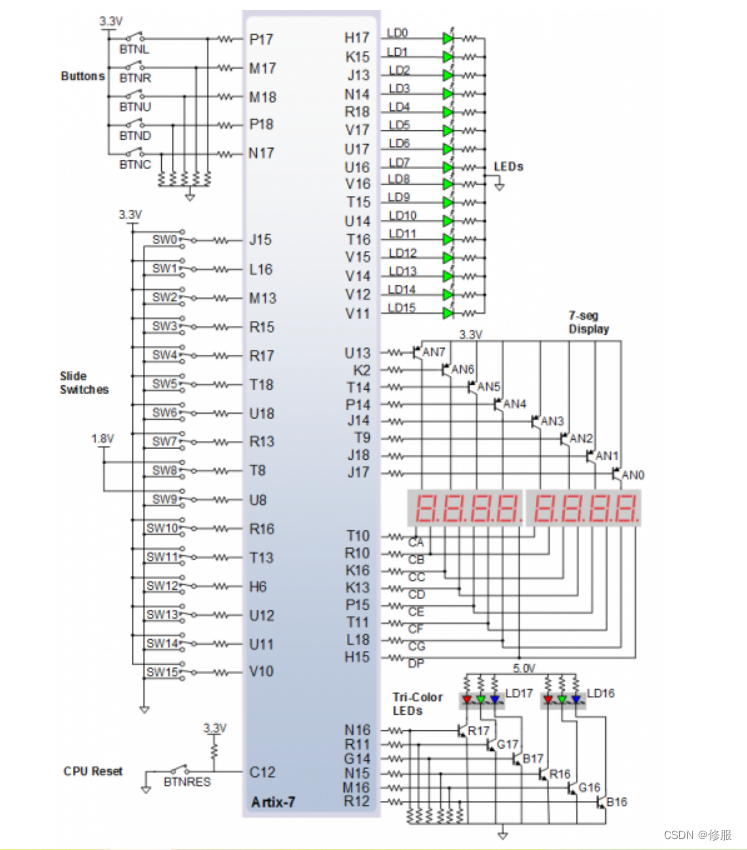Nexys A7开发板资源使用技巧 开发板用户手册介绍了开发板的:如果是初学,在这里需要了解板子上面有哪些常用的资源,比如按钮,拨码开关,七段数码管等,能够将名字和实际的器件对应。在手册中还介绍了器件的详细功能和使用方法,有余力可以去研究一下。这里是最常用的IO引脚和器件的对应,左上是五个按钮的引脚,左中是16个拨码开关,右边依次是16个LED灯,八个七段数码管,两个三色LED灯。学会看资源和引脚的对应。这个是蜂鸣器的原理图在右下角可以看到这张图对应的部件名称在PDF中使用查找内容功能查找AUD_PWM就可以找到引脚对于名称。