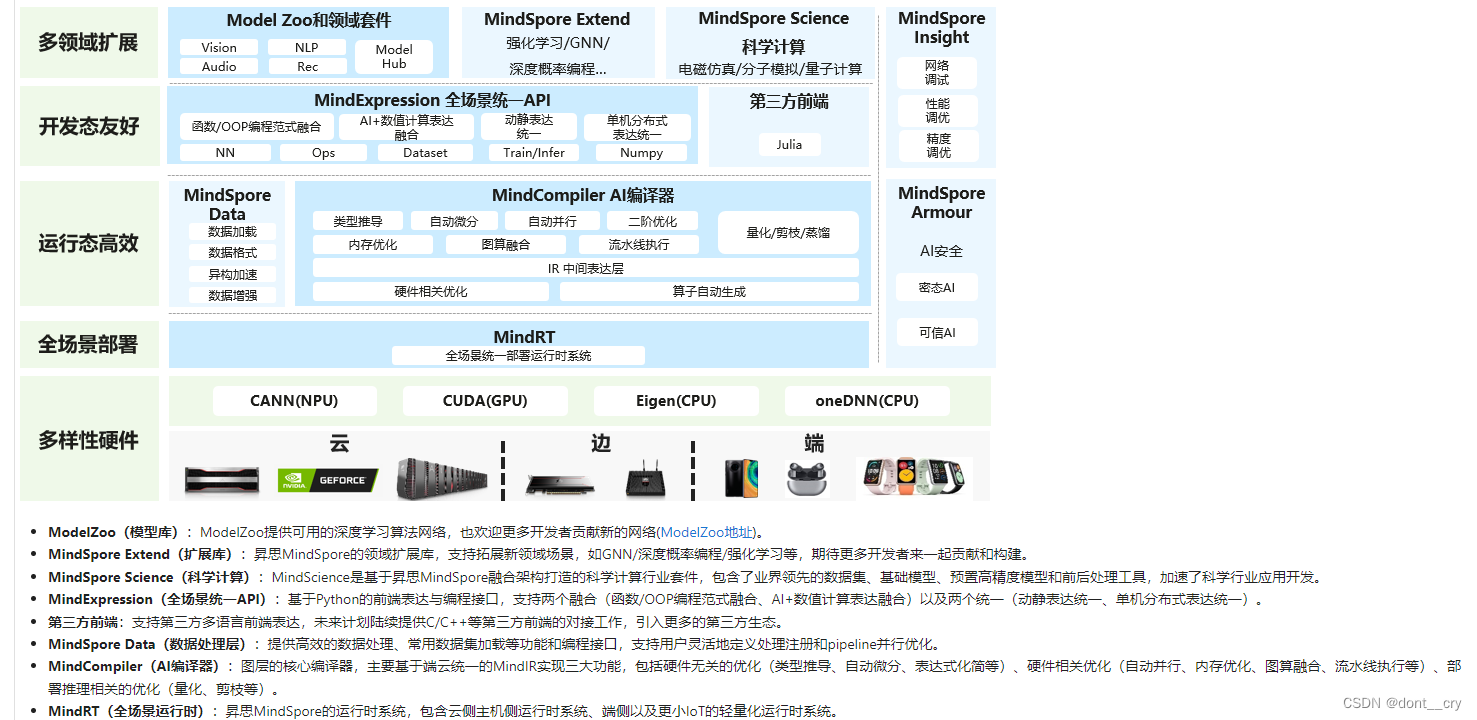 昇腾计算,是基于昇腾系列处理器构建的全栈AI计算基础设施及应用,包括昇腾Ascend系列芯片、Atlas系列硬件、CANN芯片使能、MindSpore AI框架、ModelArts、MindX应用使能等。