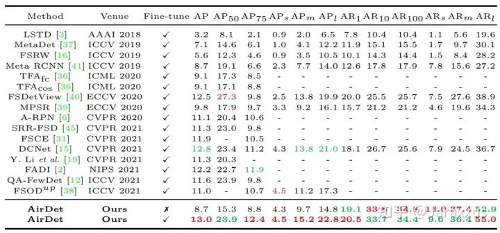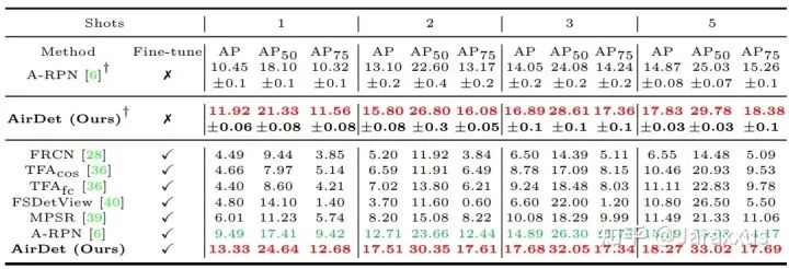 值得一提的是,由于AirDet无需微调,在所有测试数据,不同shot的设定中,我们都可采用同一个基训练出来的模型(而不需要针对不同的场景调整不同的微调超参数)。