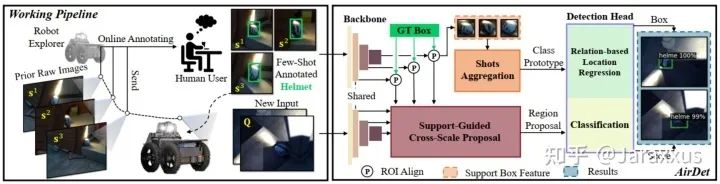 由于其在自主探索中的重要作用,FSOD受到了机器人界越来越多的关注。这是因为我们通常期望机器人在未知环境中检测到(模型训练过程中未见过的)新物体,然而在线探索的过程中,用户只能在线标注提供少量的新类样本。譬如图一(a)中,用户提供少量标注后,方法需要检测钻孔机、头盔等未见过的新颖类别目标。