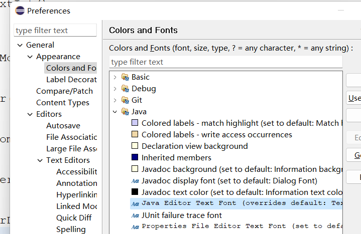 window -> Preferences -> General ->Apperance -> Colors and Font ->Java Eidtor Text Font(over.....)
