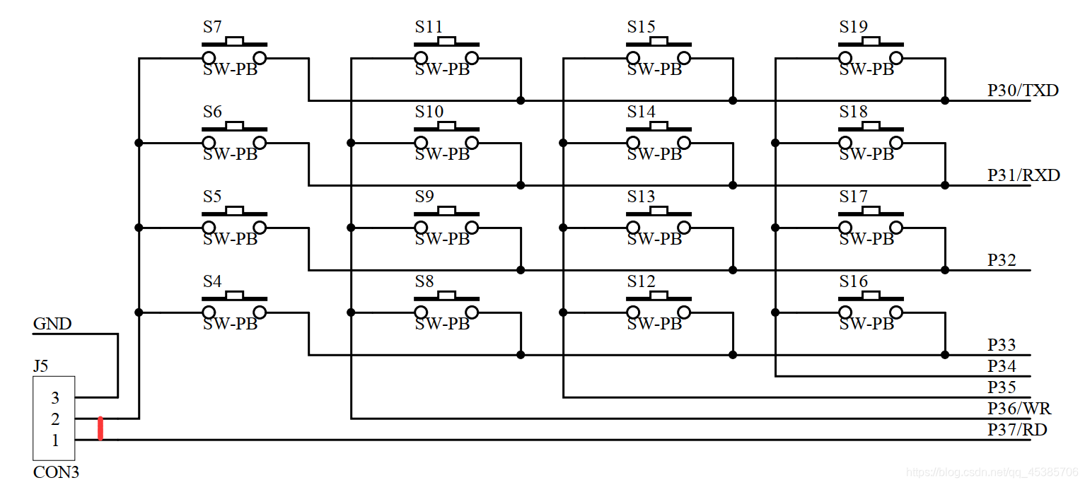需要注意的是比赛的时候用的IAP15f2k61s2单片机是没有P36和P37的,是用P44代替P37,P42代替P36,所有写程序的时候需要注意一下,大家应该对矩阵键盘的扫描原理清楚吧,这里不在对矩阵键盘的扫描原理做讲解,主要是针对一个题目做出相应程序设计。