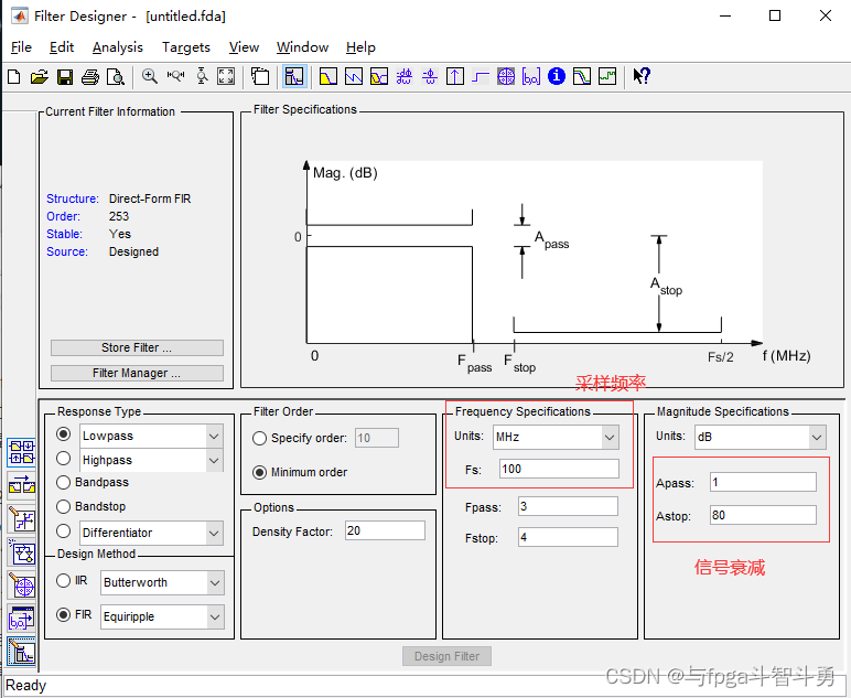 滤波器之matlab与vivado的联合仿真 乘法混频输入信号为0.5MHz和5MHz,采用积化和差转换后的输出信号有两个输出频率,分别为4.5MHz和5.5MHz,由于之前设置的截止频率为4MHz,故理论上是不会产生滤波信号,接下来进行仿真验证。1、产生两个信号2.5MHz和5MHz,然后对其进行混频,注意matlab中混频有两种方法,一种是两个信号相加,另一种是两个信号相乘,这两种混频结果是不同的。采用2.5MHz和5MHz信号进行乘法混频,可知混频后的频率为2.5MHz和7.5MHz,故经过滤波后应可获得2.5MHz的滤波结果。