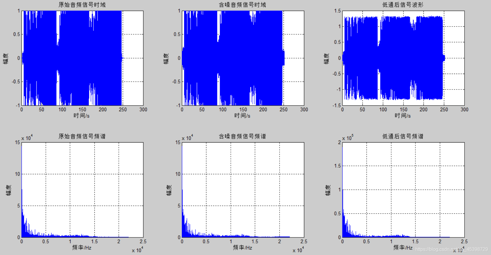 含噪音频通过低通滤波器,成功将14kHz以上的高频噪声去除,而14kHZ一下的低频信号保留,达到预期目的。