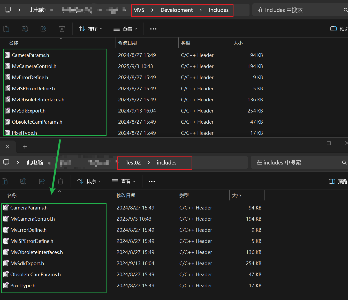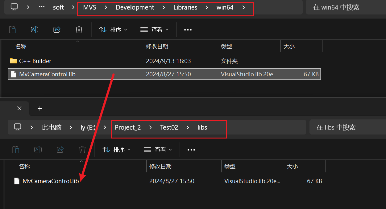 将SDK文件夹下代码MVS\Development\Libraries\win64中的MvCameraControl.lib复制到新建的libs中