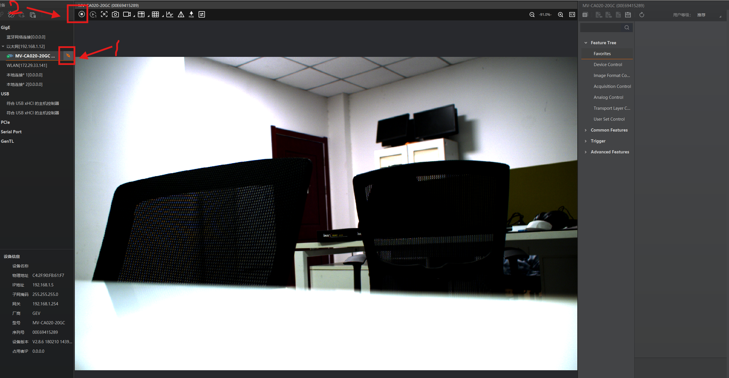 网线连接相机和电脑确保相机和电脑在同一网段,打开海康官方软件MVS,当自动识别到相机后点击连接,点击开始采集,确保相机可以正常使用。