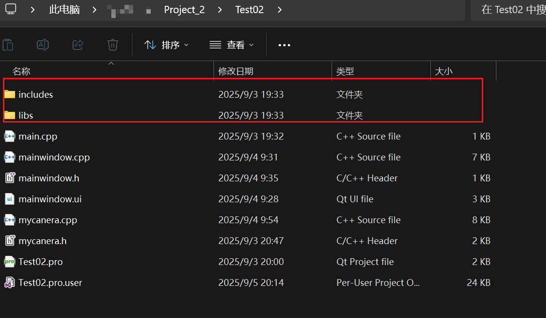 2.2 新建一个QT项目,新建好后添加mycanera.cpp和mycanera.h(原作者camera写错了)并在该项目的根目录下新建includes和libs文件夹。