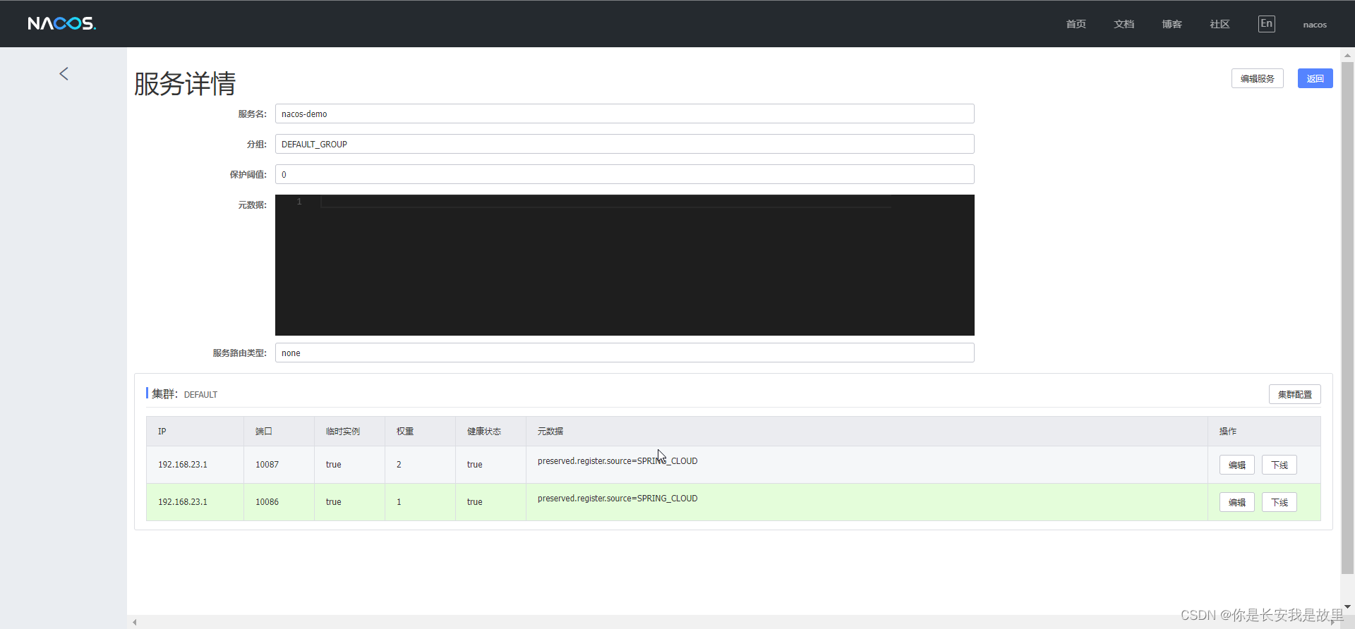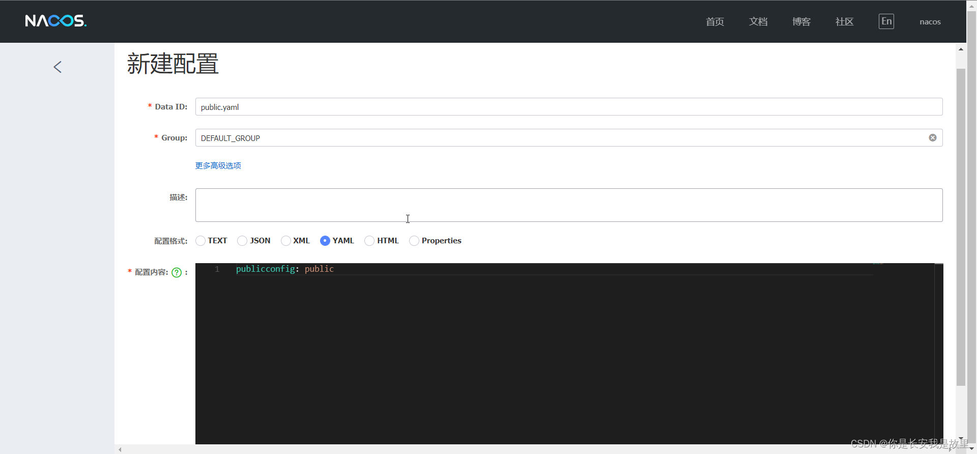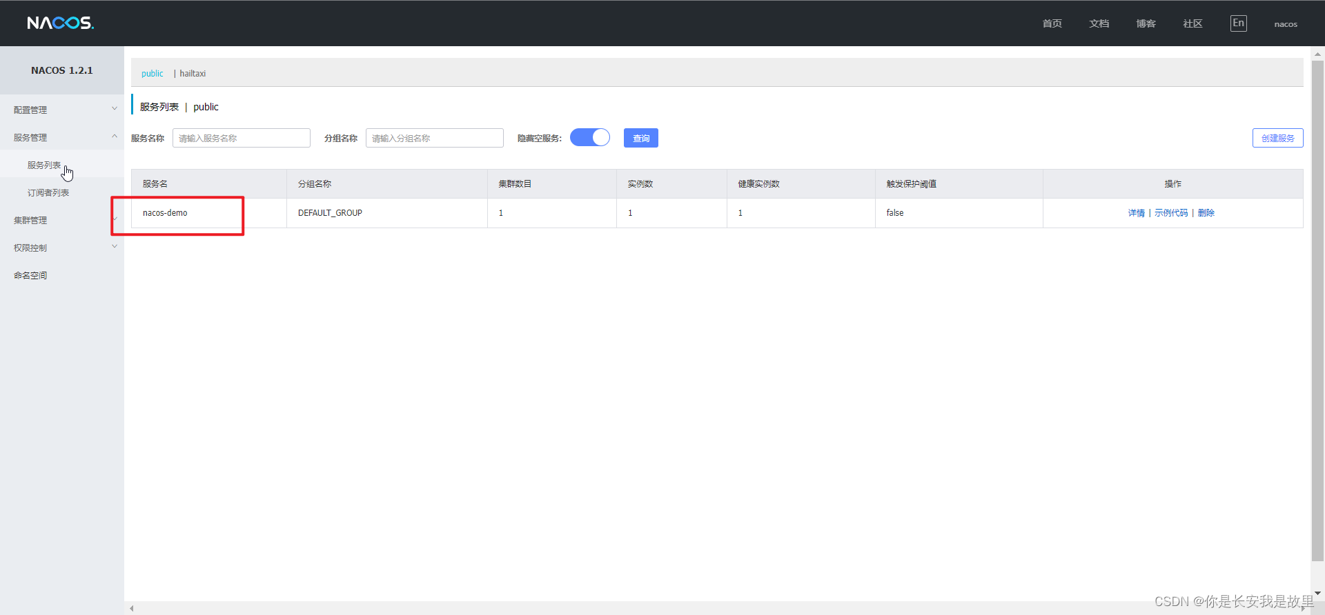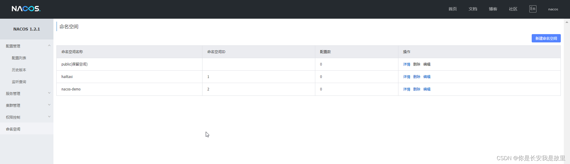 注意:可以通过在配置文件中配置namespace 属性控制服务属于哪个命名空间下的,默认不配置namespace都是在public的命名空间下,可以在命令空间菜单下新建命名空间。(namespace 是通过id与nacos命名空间 关联的,命名空间可是实现数据隔离)