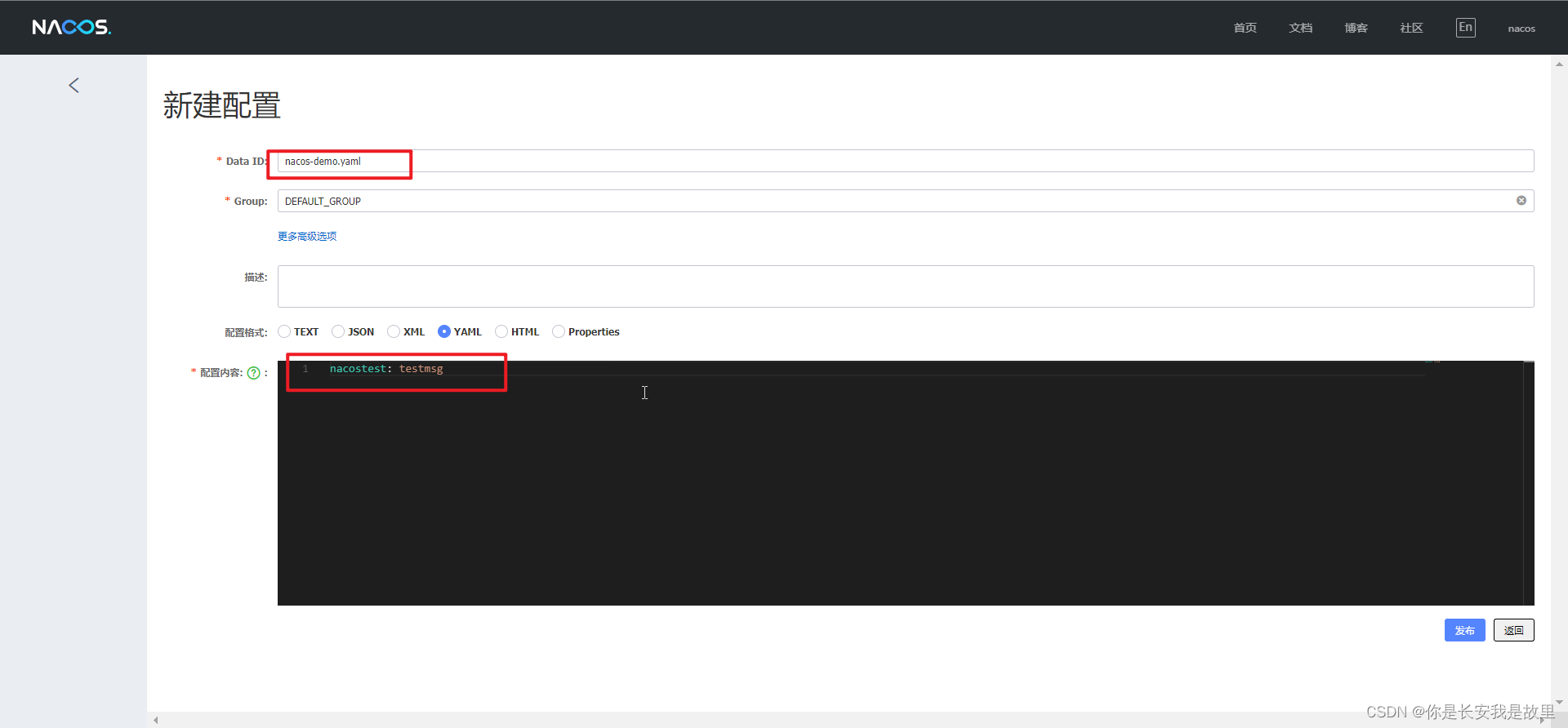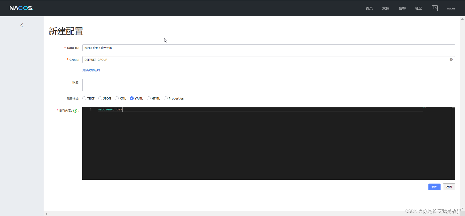 1.新建命名空间nacos-demo(实现数据隔离)id为2,配置文件中指定namespace为2