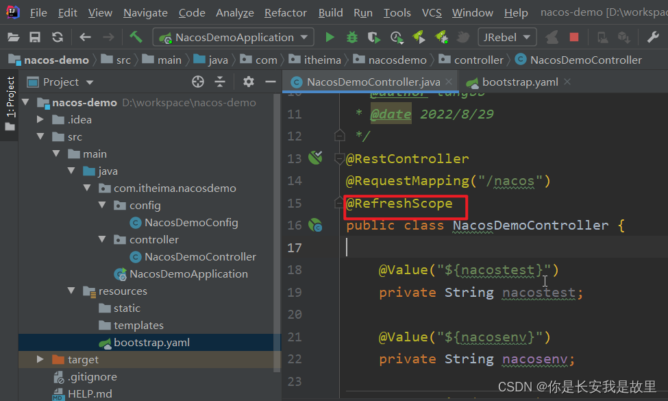 默认情况下nacos已经实现了自动配置刷新功能,如果需要刷新配置直接在控制器中加入@RefreshScope注解即可