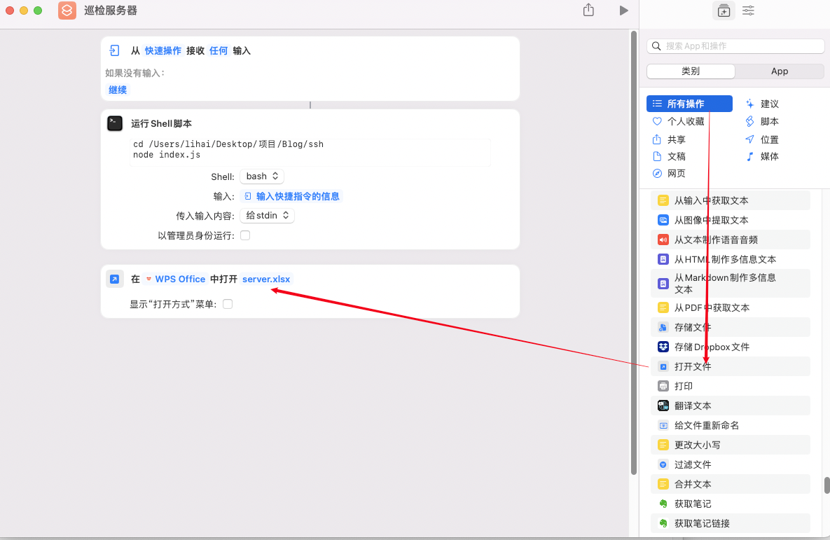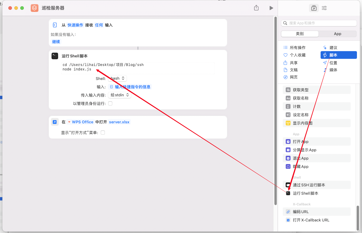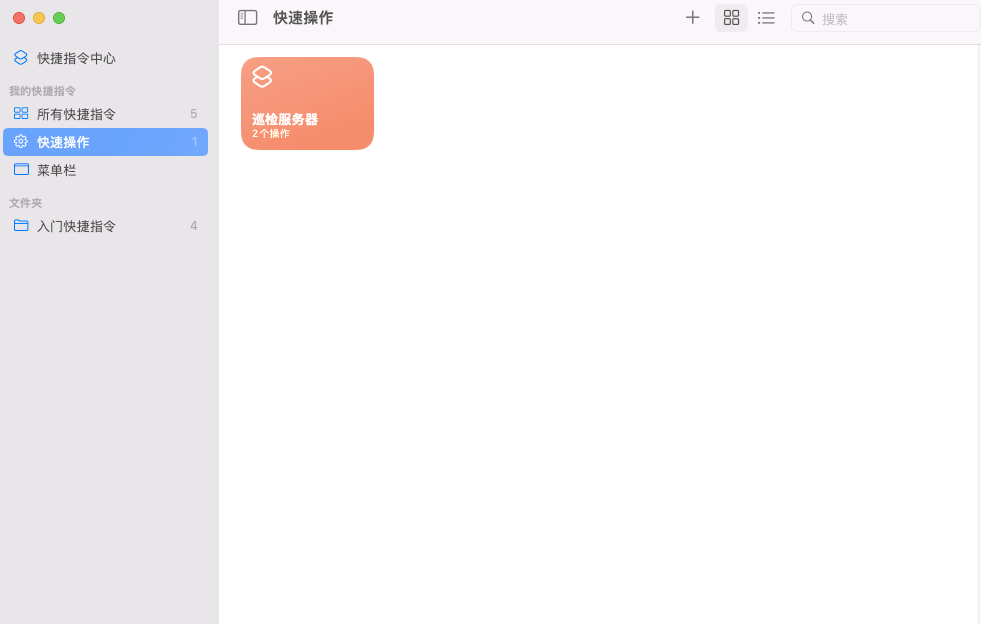 快捷指令可以运行Shell。这样只需要编写一个名字叫做【巡检服务器】的快捷指令。
