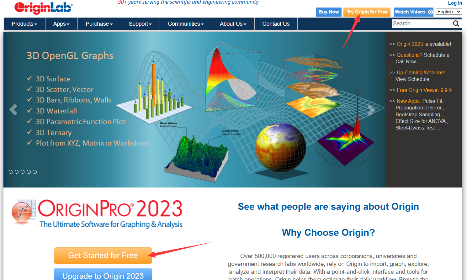 1.浏览器中打开https://www.originlab.com,点击左下角“Get Started for Free”或者右上角“Try Origin for Free”