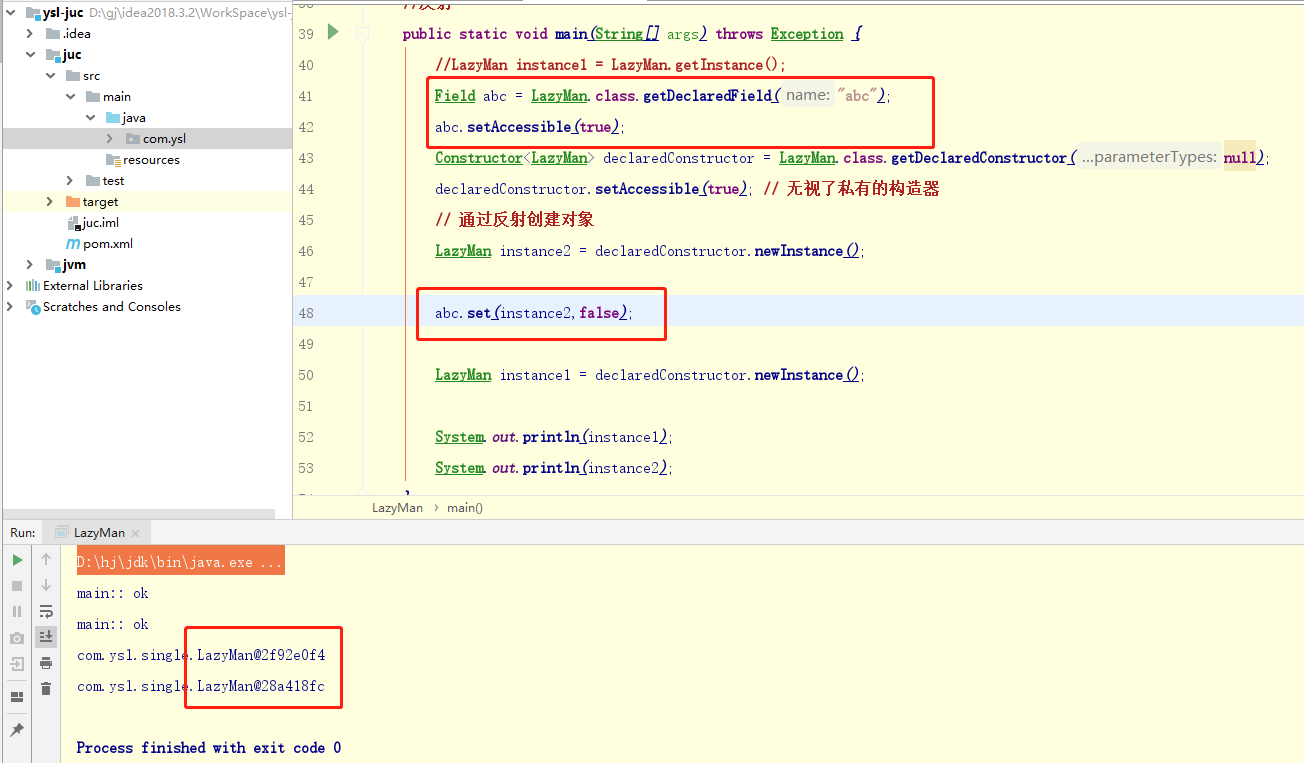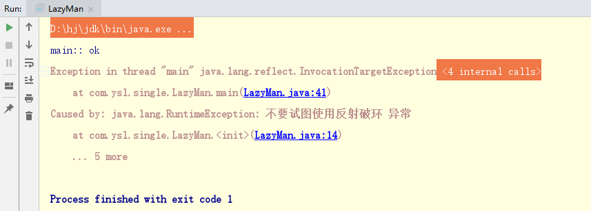 Constructor<LazyMan> declaredConstructor = LazyMan.class.getDeclaredConstructor(null);
