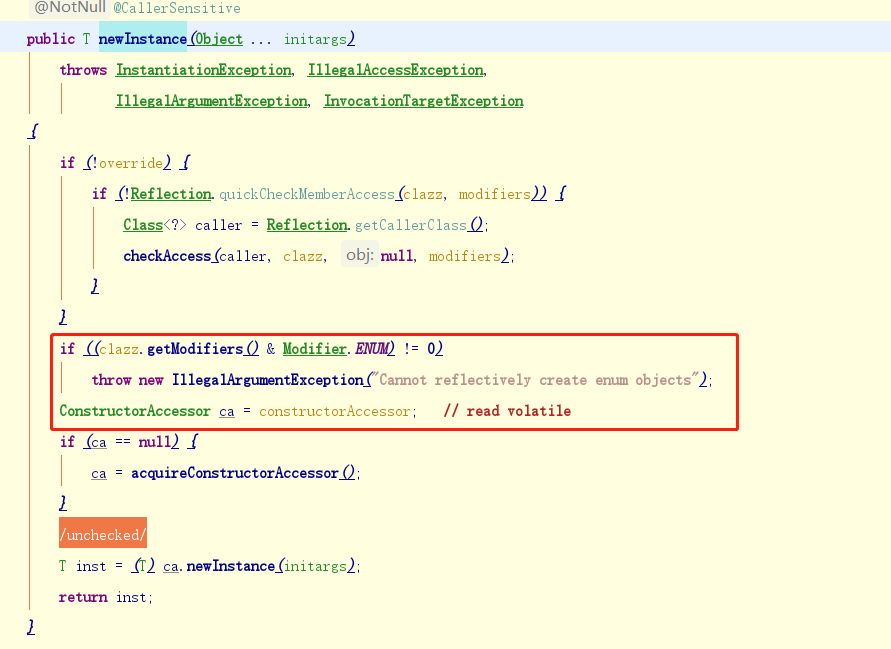 EnumSingle instance2 = declaredConstructor.newInstance();