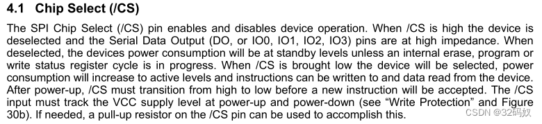 当CS被拉低,装置将会被选择,能量消耗将会增加到激活水平,命令可以被写或者数据可以被读。上电后,CS必须从高到低的转变,在一个命令被传来之前。CS输入必须在上下电的时候跟随VCC供能水平。如果需要,一个上拉电阻可以帮助完成这个