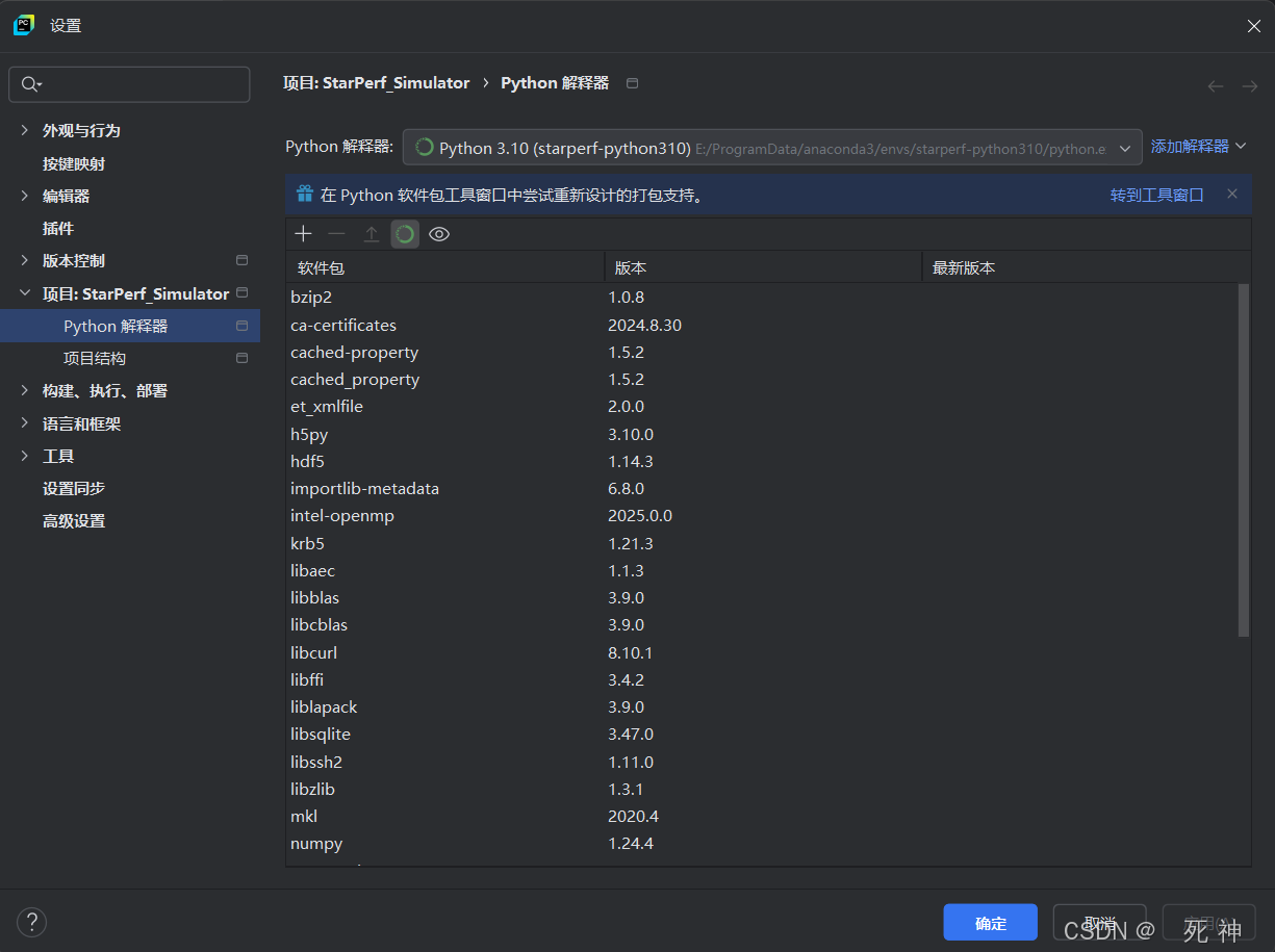 在pycharm中打开StarPerf的项目,点击设置,在项目解释器中添加此环境并应用: