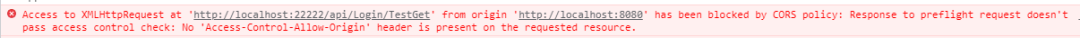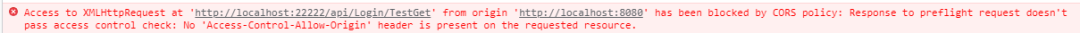 Access to XMLHttpRequest at 'http://localhost:22222/api/Login/TestGet' from origin 'http://localhost:8080' has been blocked by CORS policy: Response to preflight request doesn't pass access control check: No 'Access-Control-Allow-Origin' header is present on the requested resource.