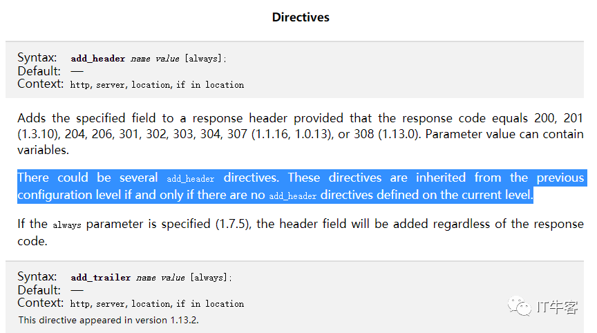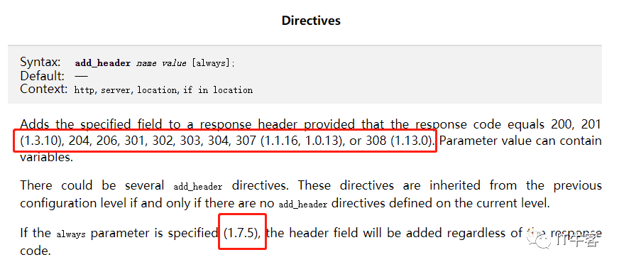 指令用于添加返回头字段,当且仅当状态码为图中列出的那些时有效。如果想要每次响应信息都携带头字段信息,需要在最后添加always(经我测试,只有Access-Control-Allow-Origin
