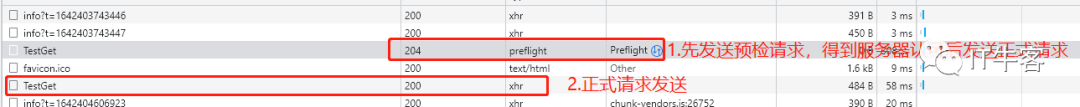 什么是预检请求?:当发生跨域条件时候,览器先询问服务器,当前网页所在的域名是否在服务器的许可名单之中,以及可以使用哪些HTTP动词和头信息字段。只有得到肯定答复,浏览器才会发出正式的XMLHttpRequest