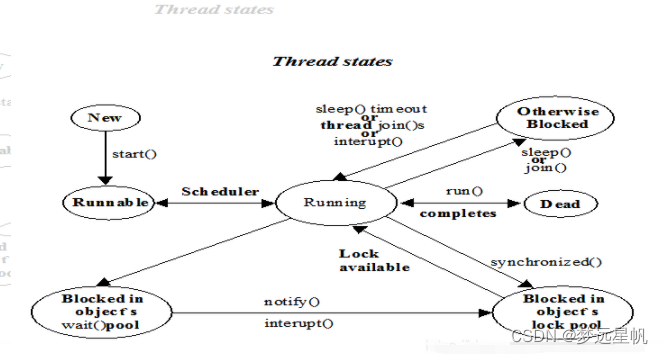 对与一个线程对象,只能调用一次其start()方法!start调用后,线程只是处与Runnable(可运行状态)---JVM并不保证马上执行其run方法,只有分配到时间片后,线程才进入Running状态;运行中的线程,可以从sleep(),wait(),interupt(),join()中恢复重新进入Running状态,但一旦run()方法执行完毕,线程就完蛋了,处理Dead状态---再也不能通过其它方法调用恢复到run()方法中,除非你重新new一个线程对象,并设用其start()方法---这却是创建了一个新的线程。如下图示,是线程可能导致其所处状态与对应方法的示意图: