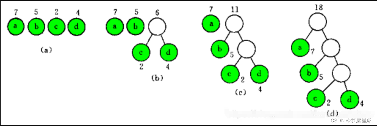 (2)在F中选取两棵根结点的权值为最小的数作为左、右子树以构造一棵新的二叉树,且置新的二叉树的根结点的权值为左、右子树上根结点的权值之和。
