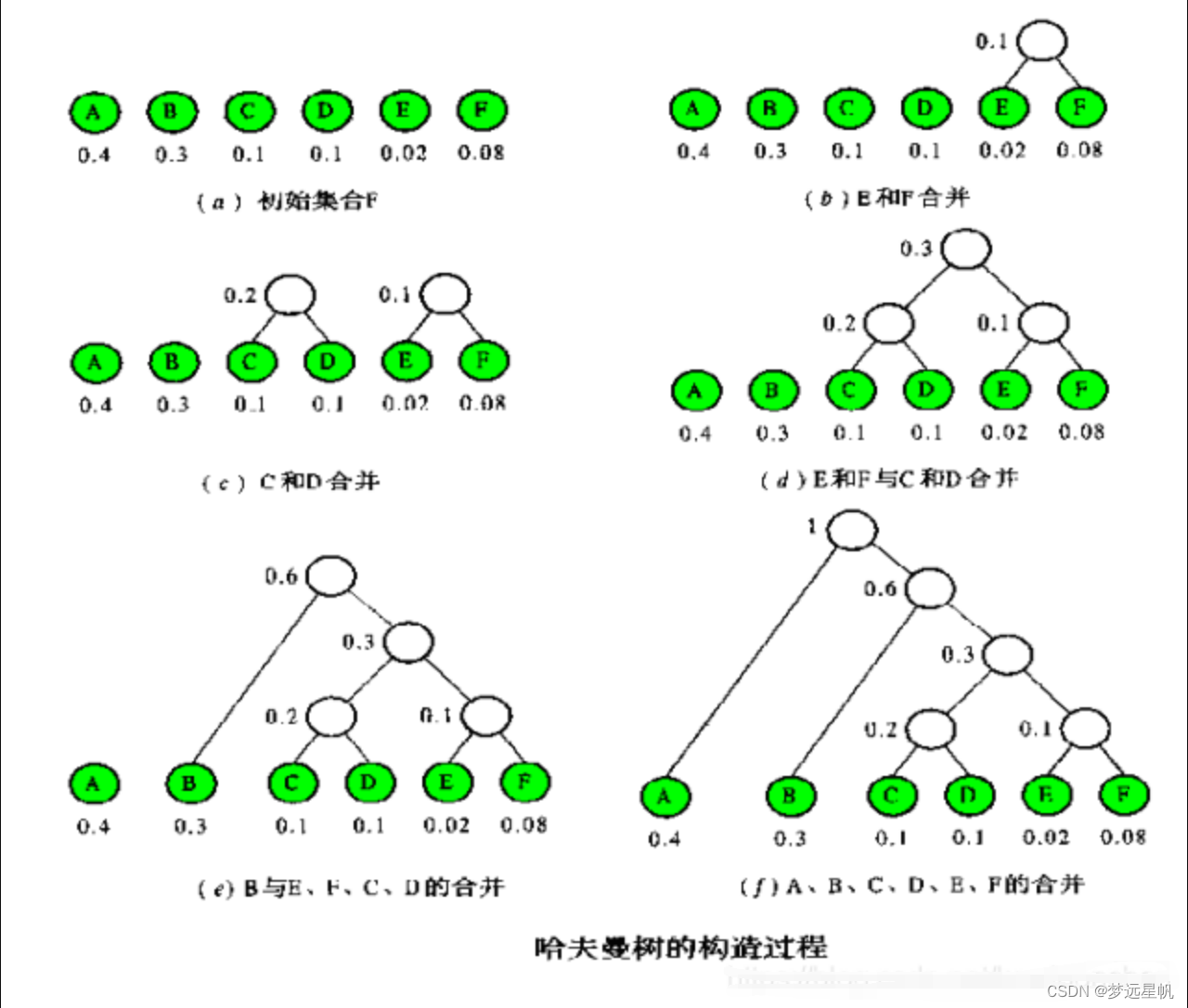 (4)重复(2)和(3)直到F中只含一棵树为止,这棵树就是哈夫曼树。