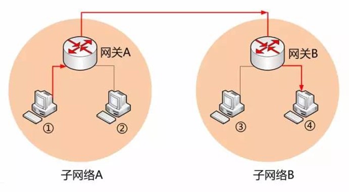 上图中,1号电脑要向4号电脑发送一个数据包。它先判断4号电脑是否在同一个子网络,结果发现不是(后文介绍判断方法),于是就把这个数据包发到网关A。网关A通过路由协议,发现4号电脑位于子网络B,又把数据包发给网关B,网关B再转发到4号电脑。