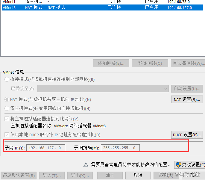 (2)查看 Linux 虚拟机的虚拟网络编辑器,编辑->虚拟网络编辑器->VMnet8