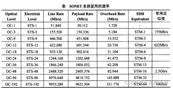 同步数字系列SDH中最常用的是STM-1(155.520Mb/s)、STM-4(622.080Mb/s),STM-16(2488.320Mb/s)和STM-64(10Gb/s),参考下表