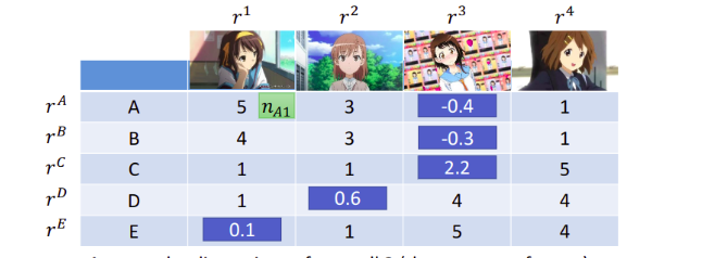 购买公仔数目看成matrix X X X,纵坐标代表肥宅 { r A \{r^A {rA、 r B r^B rB、 r C r^C rC、 r D r^D rD、 r E } r^E\} rE},而横坐标代表公仔 { r 1 \{r^1 {r1、 r 2 r^2 r2、 r 3 r^3 r3、 r 4 } r^4\} r4},其中每个肥宅个体和每个公仔个体都是用feature vetor来表示。matrix X X X里的每个element,都是由属于肥宅的feature vector和属于公仔的feature vector的内积得到。