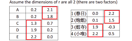 假设latent factor的数目等于2,则人的属性 r i r^i ri和动漫角色的属性 r j r^j rj都是2维的vector,在进行Matrix Factorization之后得到肥宅和公仔各自的latent factor,并利用latent factor可以预测缺失值。