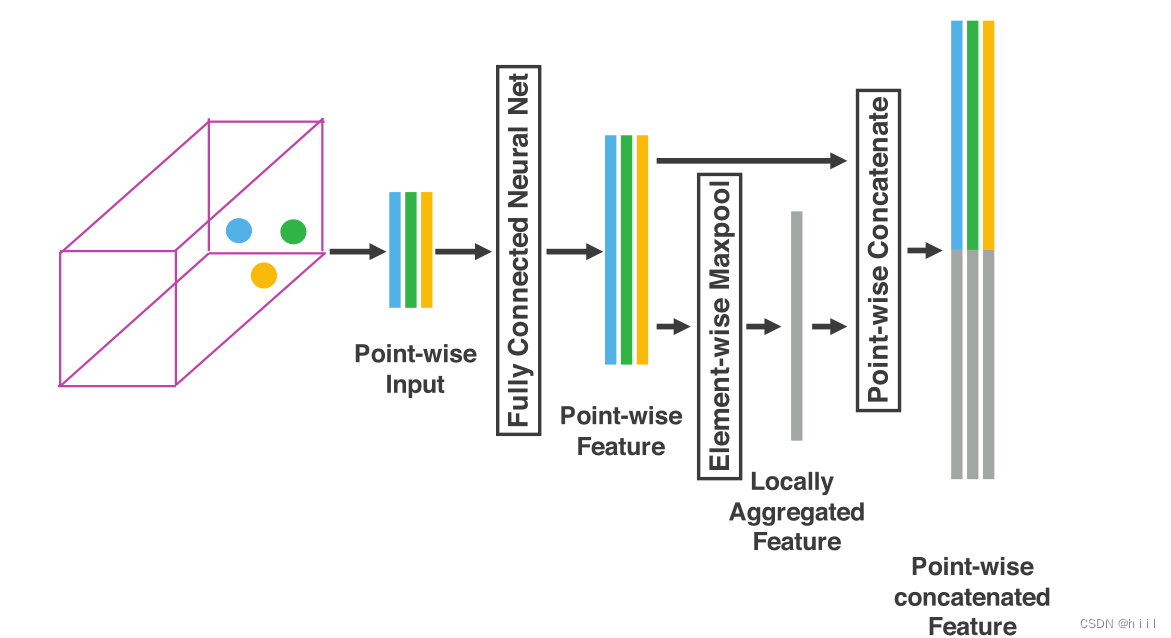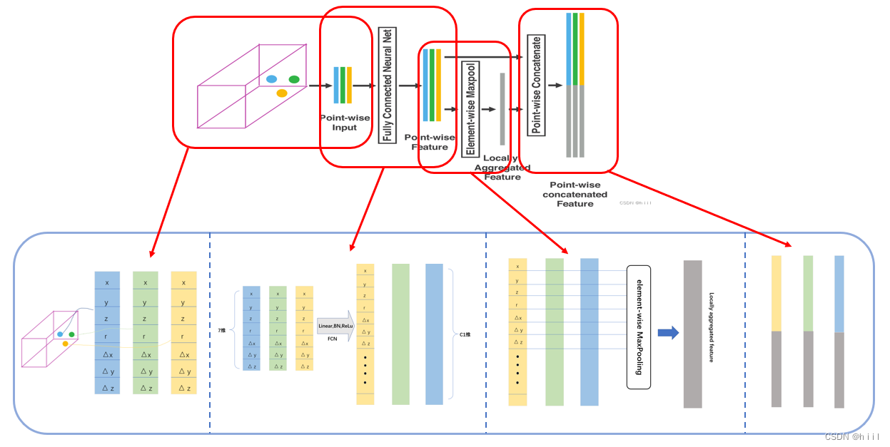 ,把这几个特征加在点特征的后面,这样每个点的特征不仅包含自身的信息,也包含了局部的信息,这也是一种特征增强的方法。现在就得到了某体素中一个点的完整表述。也就是上图中的input: