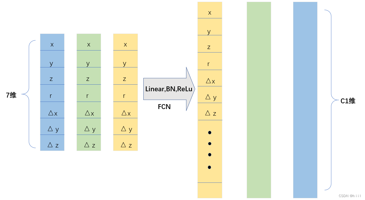 然后使用PointNet中提到的维度扩升的方法,通过FCN(linear,bn,relu)把维度从7升到了C1。